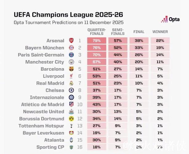 欧冠夺冠赔率更新:阿森纳22.6%居首,拜仁紧随其后